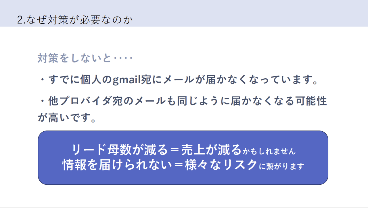 他にも、今後更なるガイドラインの強化の可能性があることもリスクとして考えられます。DMARCは、なりすましメールをなくすことを目的として作られたものです。Gmailは今のところnoneを許容していますが、近い将来、quarantineやrejectに引き上げる可能性はかなり高いと言えます。当然Gmail以外の他のプロバイダもガイドラインの引き上げに追随するはずです。