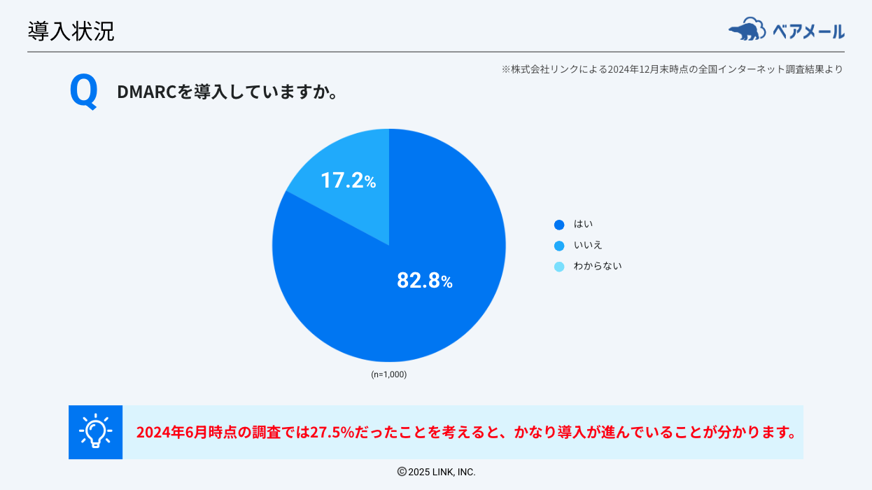 こういった最悪の事態を避けるためにも、企業は積極的にDMARCの導入・運用を進めるべき、と言えます。