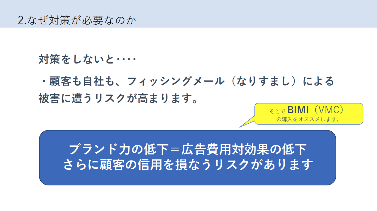 なりすましメールを送られている企業には、お客さまから「怪しいメールが届いたけど、このメールはどうしたらいいのか」といった問い合わせが、多数寄せられます。BIMIに対応することでなりすましメールと正規メールの違いを明確にできれば、こういった問い合わせに対応するためのリソース、時間の削減にもつながります。これも企業にとっては大きなプラスではないでしょうか。