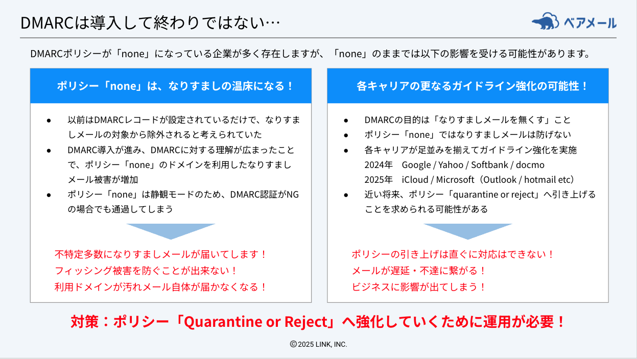 まず、なりすましメールとして悪用される可能性があること。これまでは、たとえポリシーがnoneであっても、DMARCを導入しているだけで、なりすましメールの抑止につながると考えられていました。しかし、DMARCの普及に伴い、その仕組みを理解した上で悪用する業者もでてきました。彼らはポリシーがnoneであれば、メールが届くことを把握しているため、none設定のドメインが標的とされるケースが急増しています。