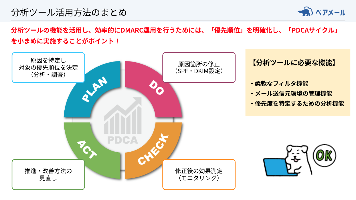 DMARCの運用は、エラーが発生している送信環境を確認して、エラーの原因を突き止め、優先順位を付けて改善していく。一度PDCAのサイクルを構築できれば、後はそれを回していくだけです。「なりすましメールをブロックし、届けなければならないメールを確実に届ける」ために、DMARCレポートの分析ツールを活用して、ぜひポリシー強化の取り組みを進めていただきたいです。