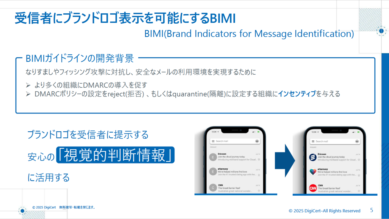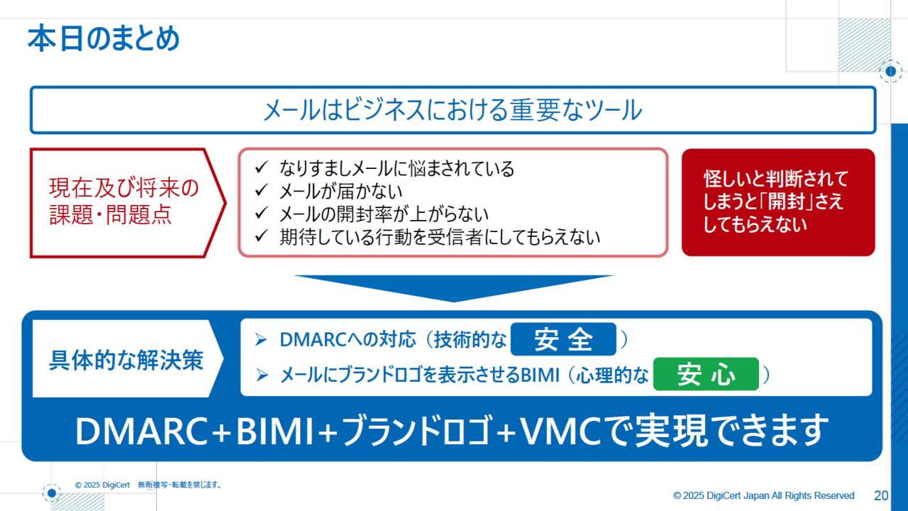 DMARCによって技術的な「安全」を、BIMIによって心理的な「安心」を、お客さまに提供することでメールを開封してもらう。そのためにも、DMARCやBIMIの導入・運用は、今後ますます重要になるはずです。すでに信頼性やブランドイメージを大切にする金融機関などの業界・企業では導入が始まっています。ぜひDMARCのポリシー強化とあわせて、BIMIの導入も検討していただければと思います。