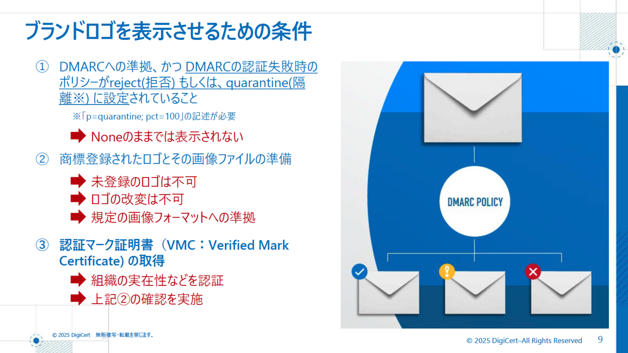 1つ目は、なりすましメールを排除する「DMARCポリシー」です。森下さんのお話しにもありましたが、DMARCには「none(何もしない)」「quarantine(隔離)」「reject(拒否)」の3つのポリシーがあります。ポリシーを「quarantine」や「reject」に設定することで、自社のブランドやお客さまをフィッシングの脅威から守ることができます。